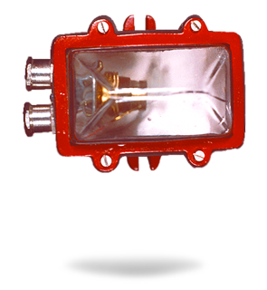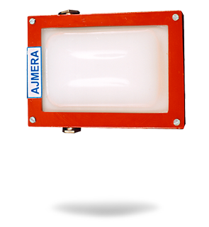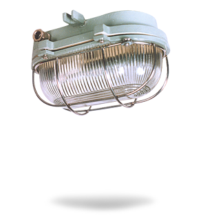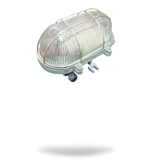 Oblong bulkhead fitting, cast Aluminium body with Aluminium hinged cover and locking arrangement oblong glass cover with protective SS wire guard, porcelain BC / ES lamp holder with 2 way connector. 2 nos. of conduit entries at top and bottom |